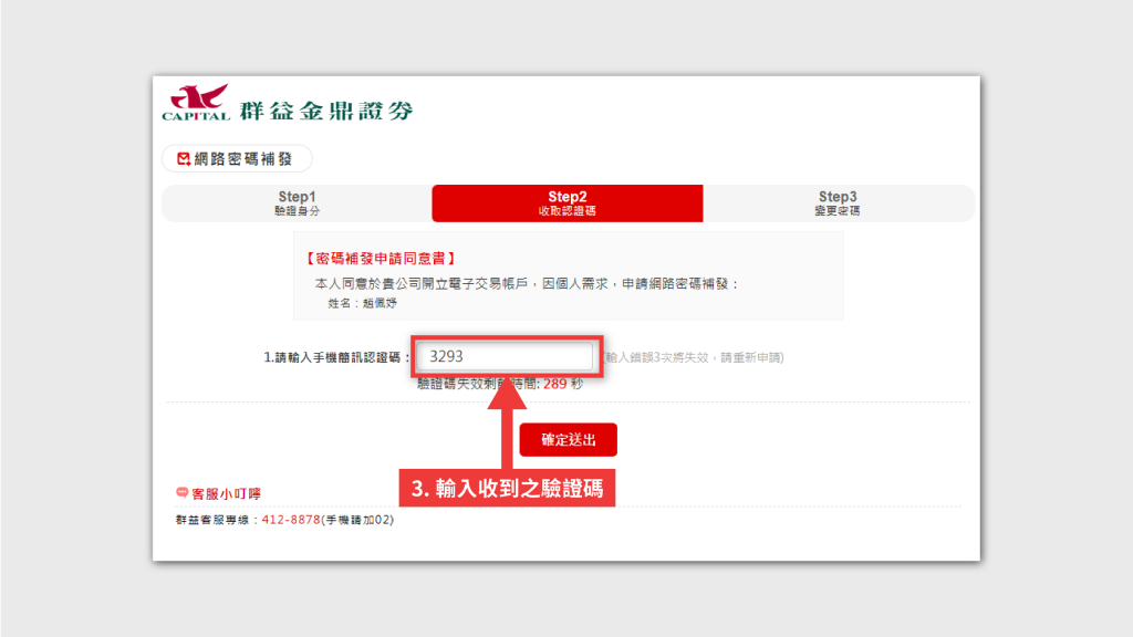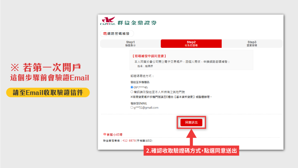 - 確認接收驗證碼方式後,點選【同意送出】。