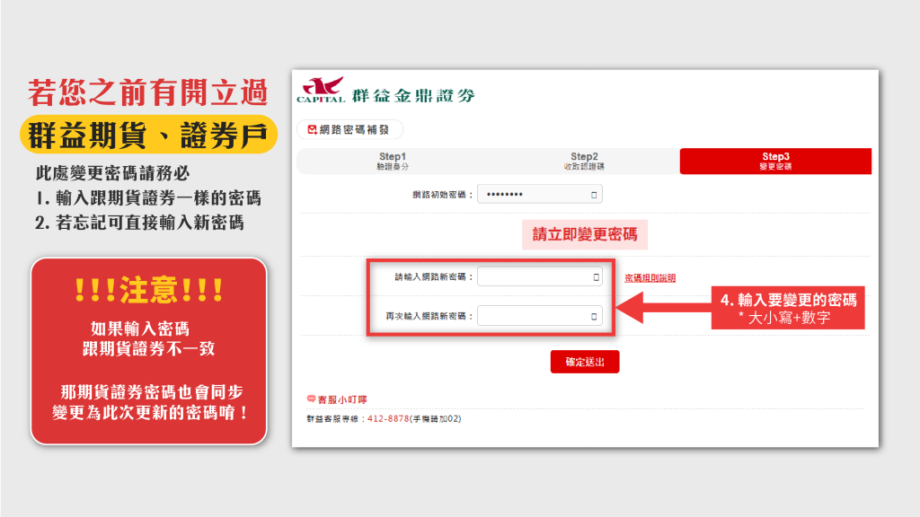 - 若輸入新密碼與原期貨證券密碼不同,系統將自動同步更新為此新密碼。