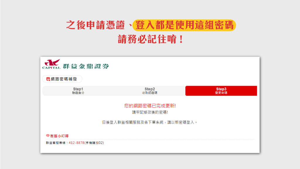 之後申請憑證、登入系統時,請務必使用此新密碼。